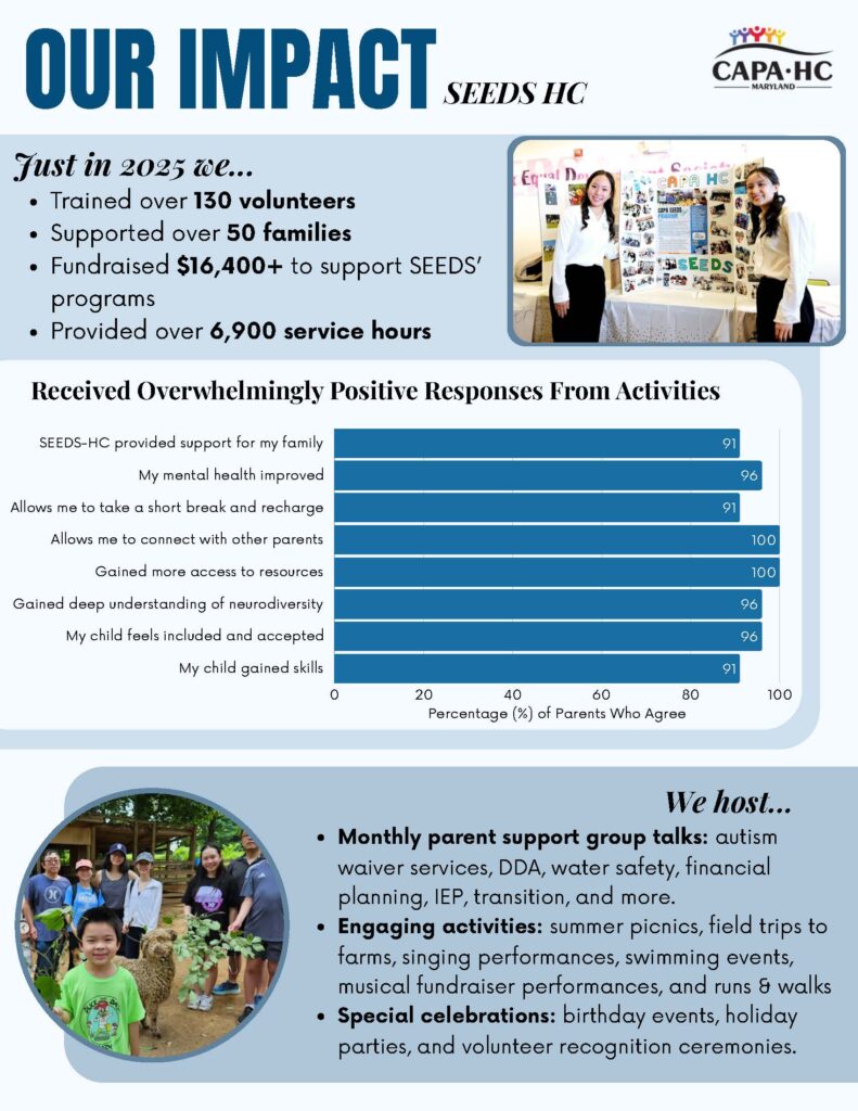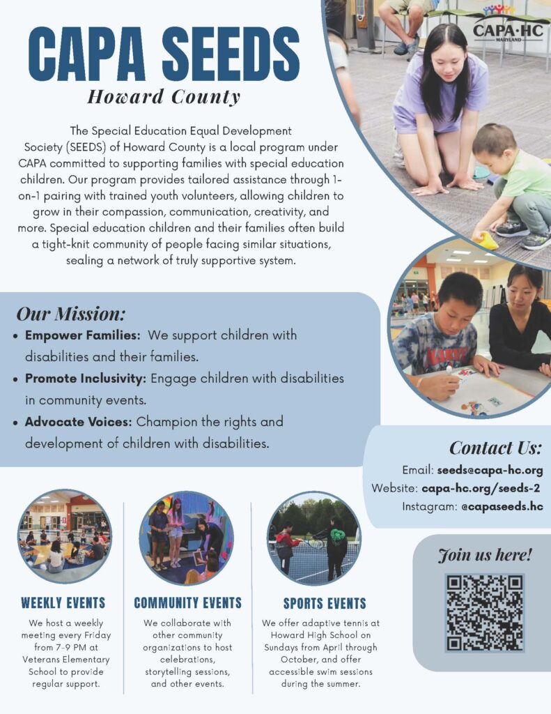The Special Education Equal Development Society (SEEDS) of Howard County is committed to supporting families with special needs children, focusing on their growth and development. Our journey is built on compassion and innovation, ensuring every child’s story is valued and uplifted. Through weekly meets and events designed to stimulate and engage children with special needs, CAPA SEEDS encourages the growth and bonding of children who may lack such. More details please click here.